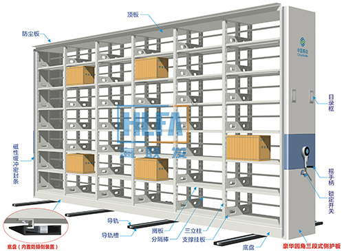 密集架按結(jié)構(gòu)分類有兩種形式,半封閉式密集架和全封閉式密集架,海發(fā)HF-MJFB051號密集架就是全封閉式密集架。全封閉式密集架主體由立柱、層板、頂板、底板、節(jié)間側(cè)板、節(jié)與節(jié)之前的封板和最外側(cè)護板、列門板等組成,比半封閉式密集架多了私密性,因此主要用于存放私密性較強或較小物品的存儲。